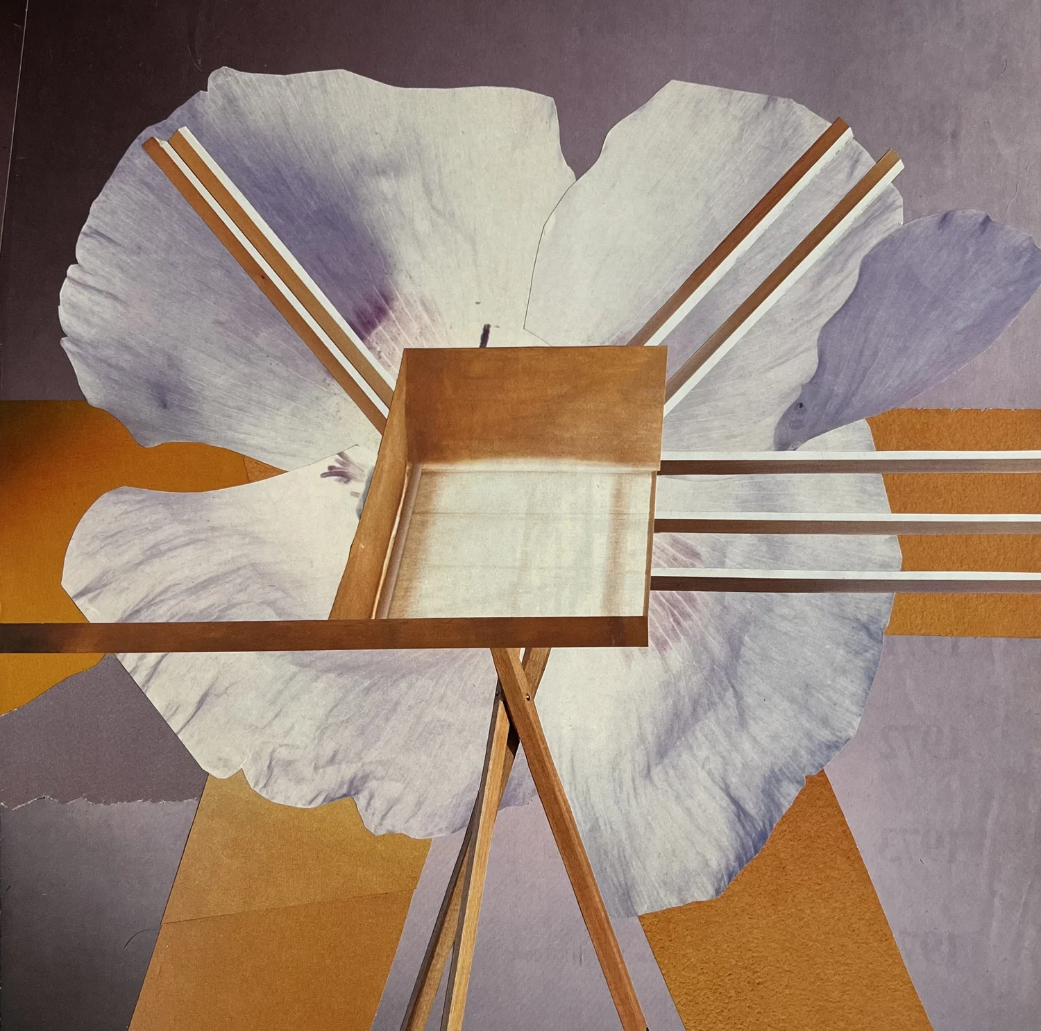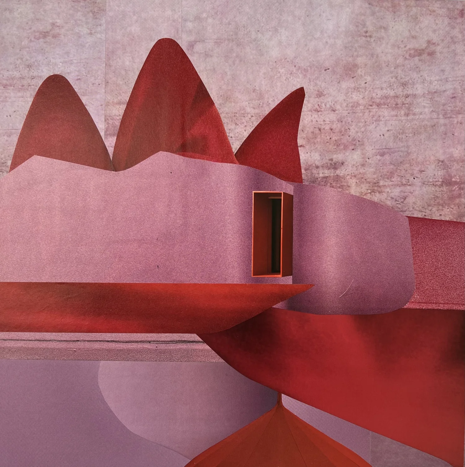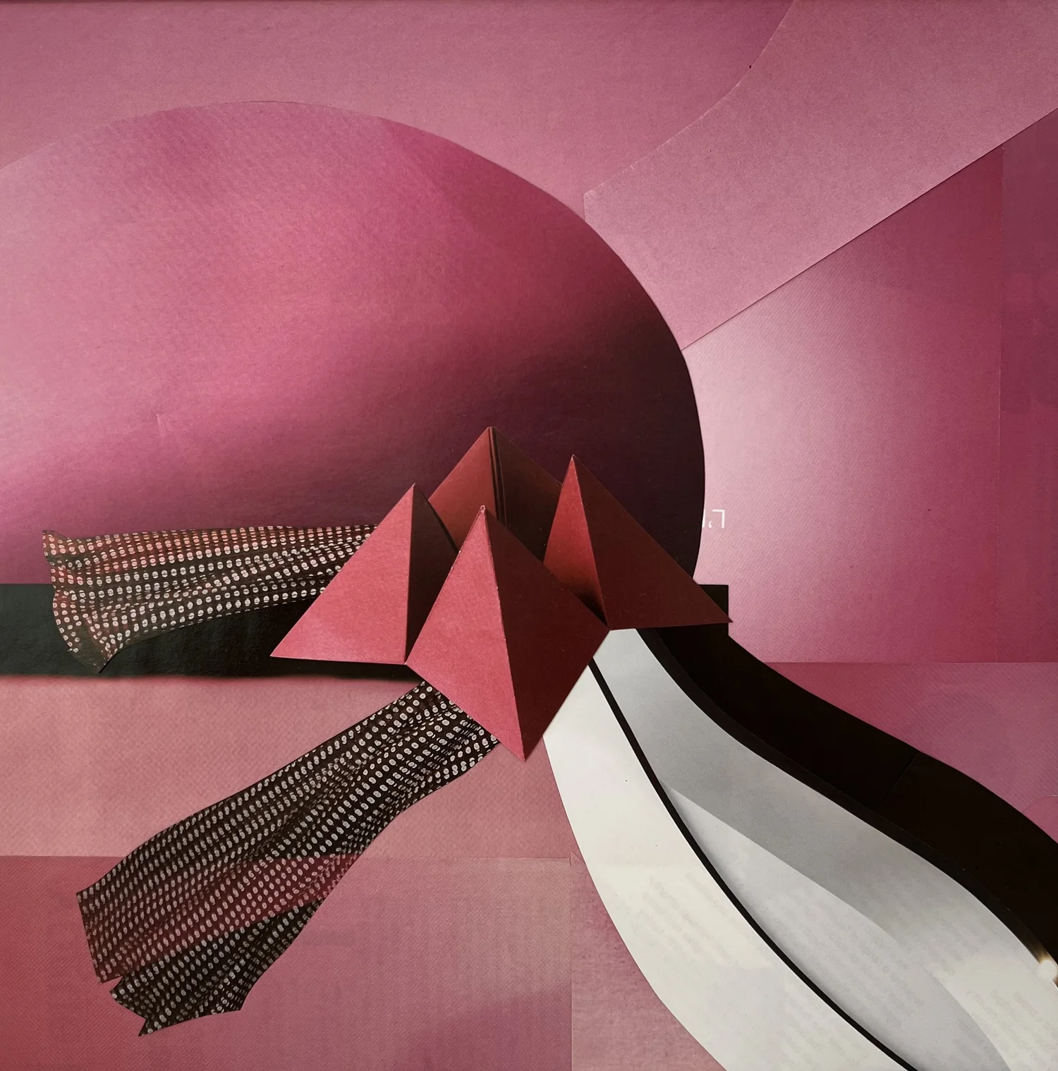 Sliding doors II, 2025, collage, recycled magazine paper on archival art board, 400mm x 400mm framed   price:  $660.00