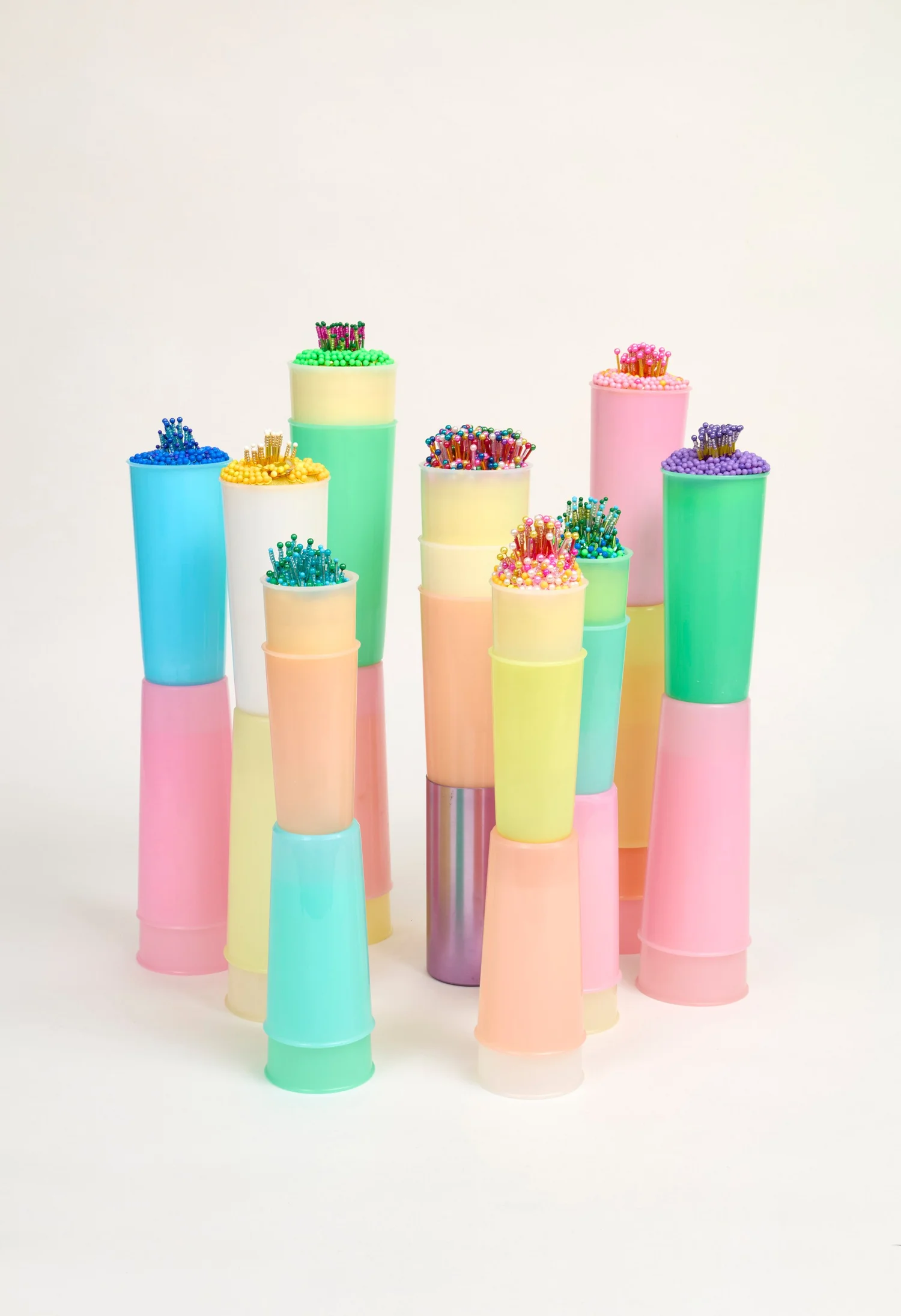 Can I have a word, 2025, Décor plastic 4 stack eggcups and pink pingpong ball. Green, yellow, oat, white, 14 x 14 x 10cm  SOLD price:  $330.00