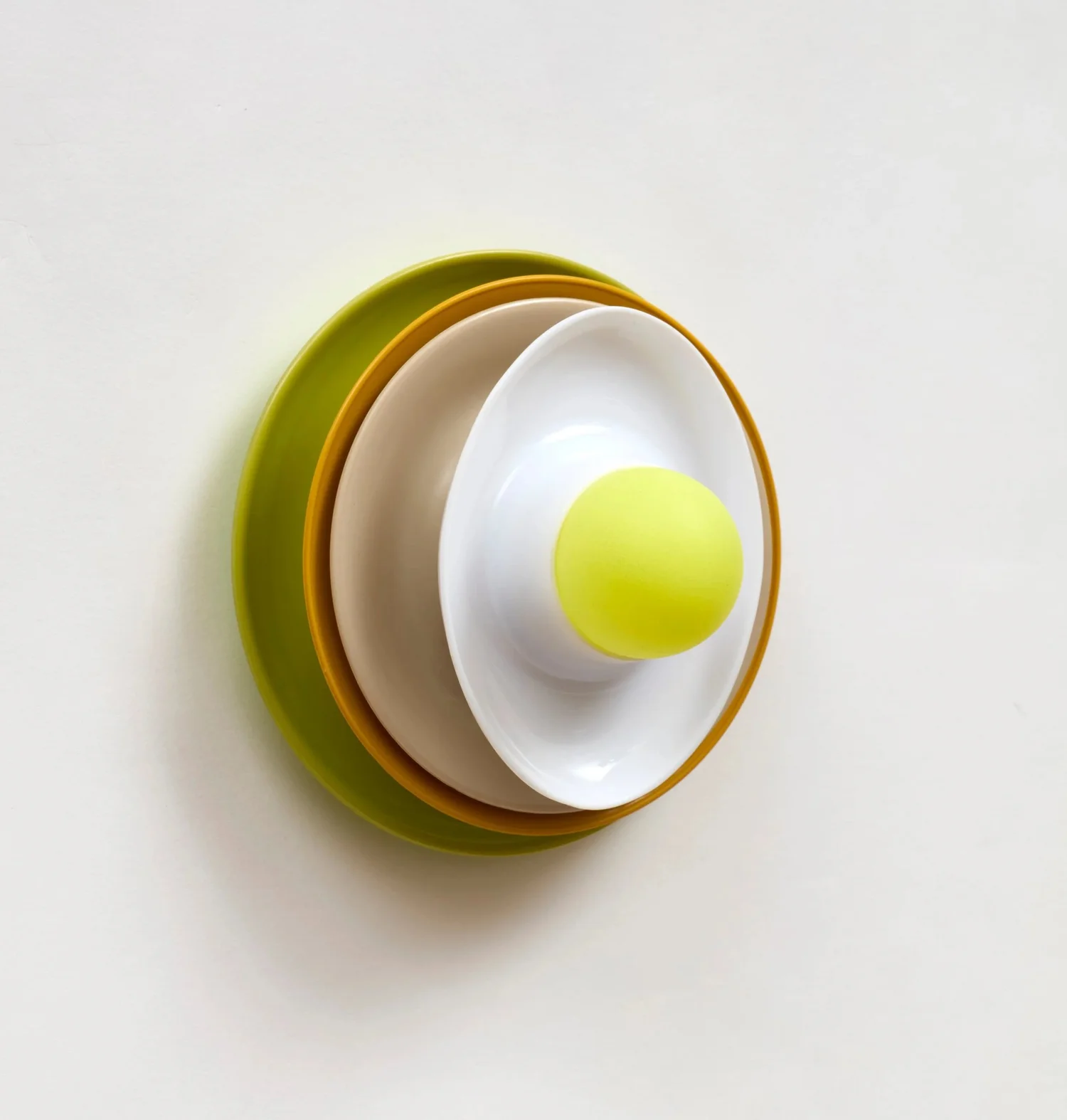 Is there anything other than now?, 2025, Décor plastic 3 stack plus stainless steel eggcups. Green, orange, oat, silver and yellow,14 x 14 x 10cm  SOLD price:  $330.00